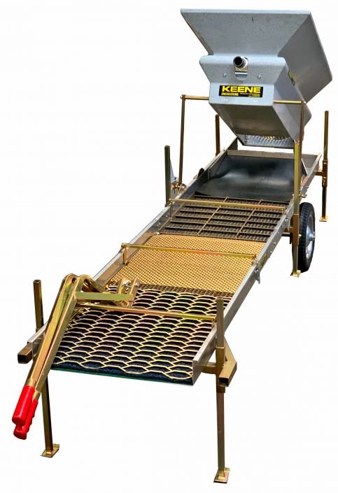 This new model features a hopper that is nearly twice the size of earlier model that can accommodate much higher volumes of material. It also comes with 3/8-inch removable Grizzle classifier screens. We also offer some optional curved screens are with improve degrading of clay and hard packed material and accommodate a rounded shovel. The new recessed spray bar is protected from impact of larger rocks and provides stronger and wider spray for a more complete washing of material. This Power Sluice is 20 inches wide, 8 feet long and capable of processing up to 4 cubic yards per hour. The sluice is equipped with 4 different riffle designs. Mirikal matting protected by a large 1/8th classifier screen, traditional Hungarian riffles, The simple but effective small expanded metal over carpet and some larger expanded metal over carpet. This riffle design is extremely versatile and very forgiving unlike some other machines that use all rubber riffles. In a heavy-duty machine like this when dredging high banking there in a lot of chaos in the sluice and the variety of carpets mats is essential to maintain high production and fine gold recovery. Net weight 110 lbs