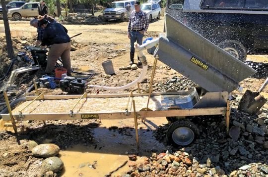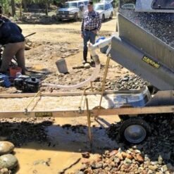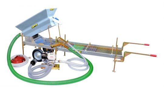 This new model features a hopper that is nearly twice the size of earlier model that can accommodate much higher volumes of material. It also comes with 3/8-inch removable Grizzle classifier screens. We also offer some optional curved screens are with improve degrading of clay and hard packed material and accommodate a rounded shovel. The new recessed spray bar is protected from impact of larger rocks and provides stronger and wider spray for a more complete washing of material. This Power Sluice is 20 inches wide, 8 feet long and capable of processing up to 4 cubic yards per hour. The sluice is equipped with 4 different riffle designs. Mirikal matting protected by a large 1/8th classifier screen, traditional Hungarian riffles, The simple but effective small expanded metal over carpet and some larger expanded metal over carpet. This riffle design is extremely versatile and very forgiving unlike some other machines that use all rubber riffles. In a heavy-duty machine like this when dredging high banking there in a lot of chaos in the sluice and the variety of carpets mats is essential to maintain high production and fine gold recovery.